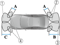 Capteur ultrasonique avant : Environ 45,0―35,0 cm Capteur ultrasonique de coin avant : Environ 38,0―25 cm |