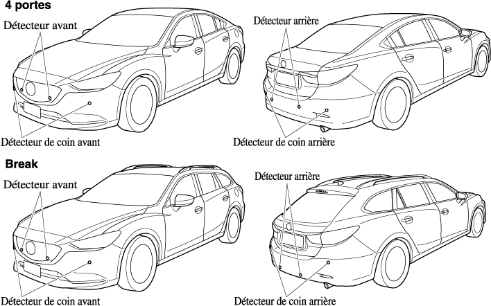Détecteur arrière: Moins d'environ 35 cm Détecteur de coin arrière: Moins d'environ 25 cm |