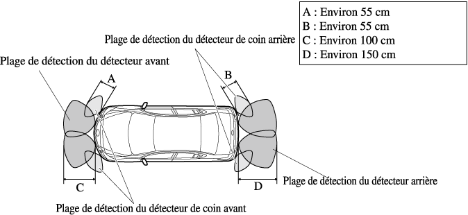 Détecteur avant: Environ 60―45 cm Détecteur de coin avant: Environ 55―38 cm |