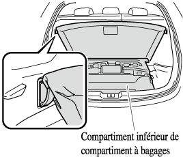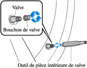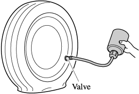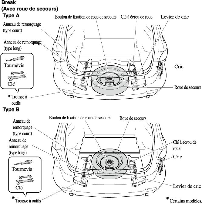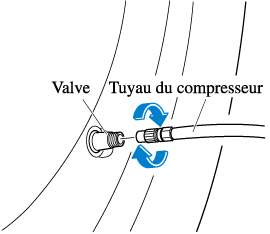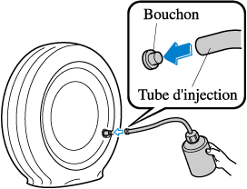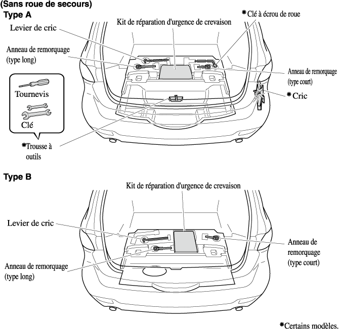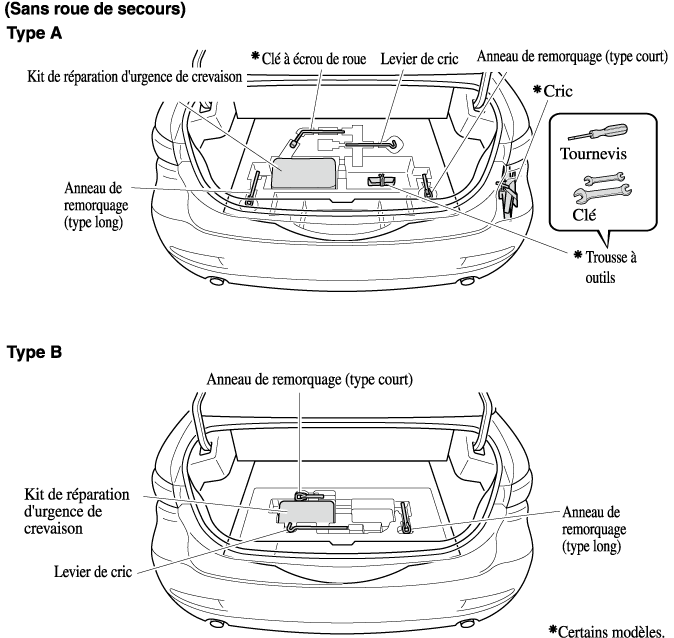 Une roue de secours n'est pas fournie avec ce véhicule Mazda. En cas de crevaison, utiliser le kit de réparation d'urgence de crevaison pour une réparation temporaire du pneu. Lors de l'exécution de la réparation, se référer aux instructions fournies avec le kit de réparation d'urgence de crevaison. Si une réparation temporaire a été effectuée sur un pneu crevé à l'aide du kit de réparation d'urgence de crevaison, demandez à un mécanicien expérimenté, un mécanicien agréé Mazda est recommandé, pour faire réparer ou remplacer le pneu dès que possible.