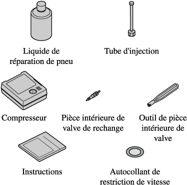 Le kit de réparation d'urgence de crevaison fourni avec ce véhicule Mazda est pour la réparation temporaire d'un pneu crevé légèrement endommagé par un clou ou autre objet pointu sur la route.