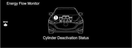 Affiche l'indication de cylindre en blanc lorsque le carburant n'est pas injecté dans le moteur. Lorsque du carburant est injecté dans le moteur, la couleur passe au rouge, puis au vert foncé lorsque le carburant est brûlé efficacement. De plus, lorsque le carburant est brûlé efficacement, SPCCI est indiqué sur l'écran. (SPCCI=Spark Controlled Compression Ignition)